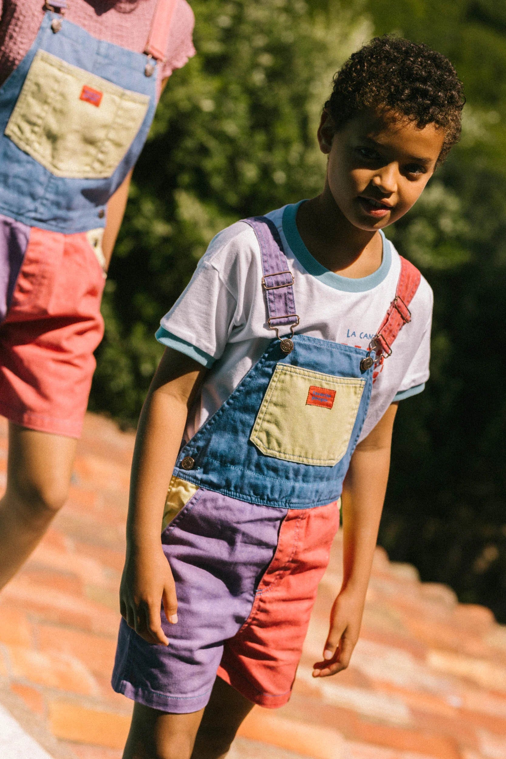 Salopette courte avec encolure droite et des bretelles réglables avec fermeture salopette. Poches combinées sur le devant, façon kangourou sur la bavette et poche plaquée au dos. Fermeture par boutons sur les côtés.