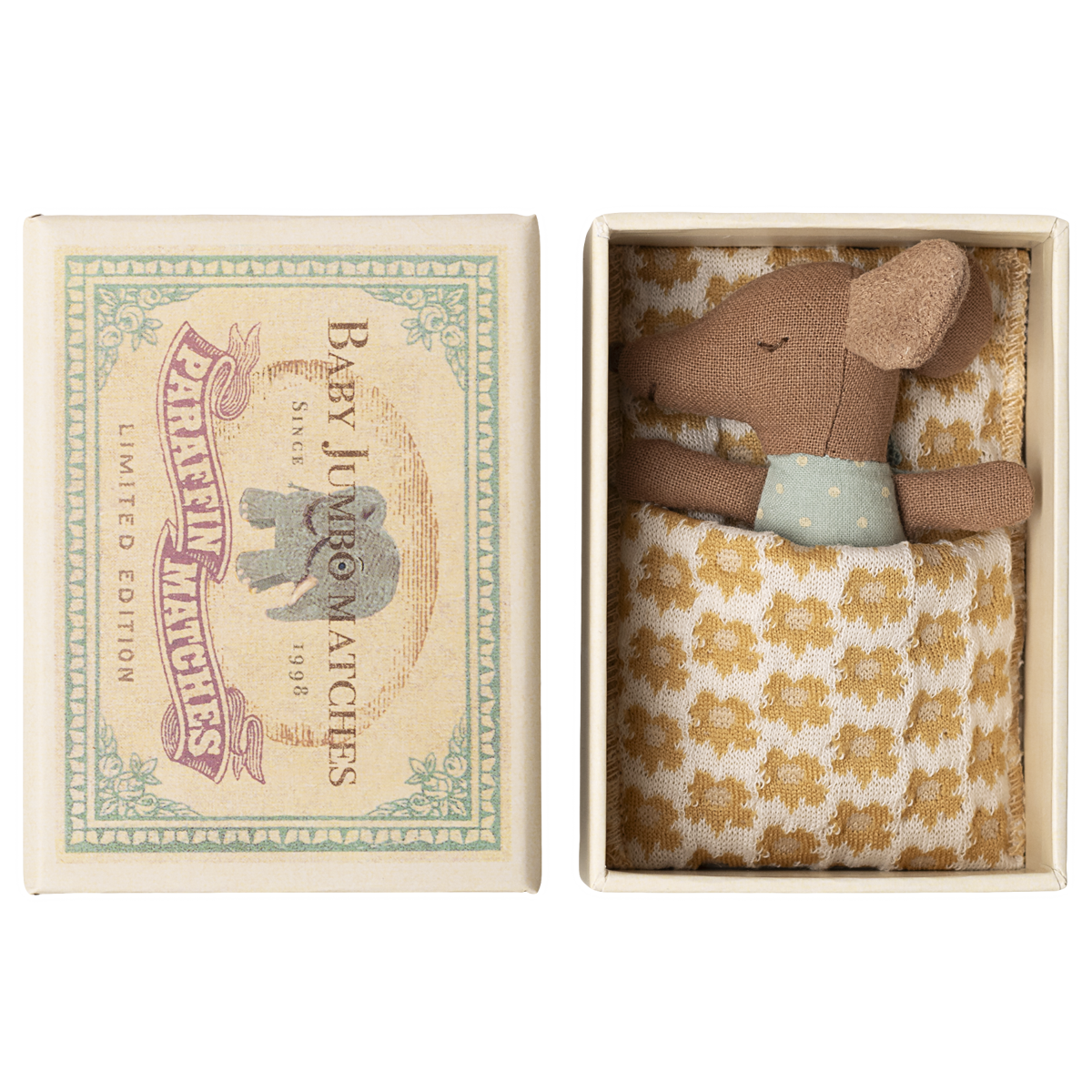 Un favori de Maileg, ce bébé souris est niché dans son lit en forme de boîte d'allumettes. Vêtue d'un confortable costume à pois orné d'une boucle, elle repose sur un doux linge de lit à motifs, prête à faire de beaux rêves. Son visage est double face, l'un endormi, l'autre éveillé, vous permettant de choisir entre un sommeil paisible et une journée de jeu.