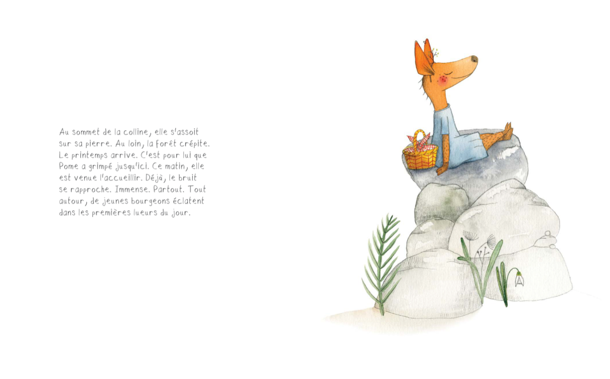 Pome et Dina se rencontrent au sommet d’une colline, au moment où éclosent les premiers bourgeons. Au fil des jours, elles s’apprivoisent tout doucement. Arrivent ensuite la chaleur, la baignade et les rires. Puis l’automne apporte les premières disputes. La venue de l’hiver, quant à elle, annonce la séparation des deux amies, car Dina doit hiverner. Leur amitié saura-t-elle traverser le temps et les tempêtes?