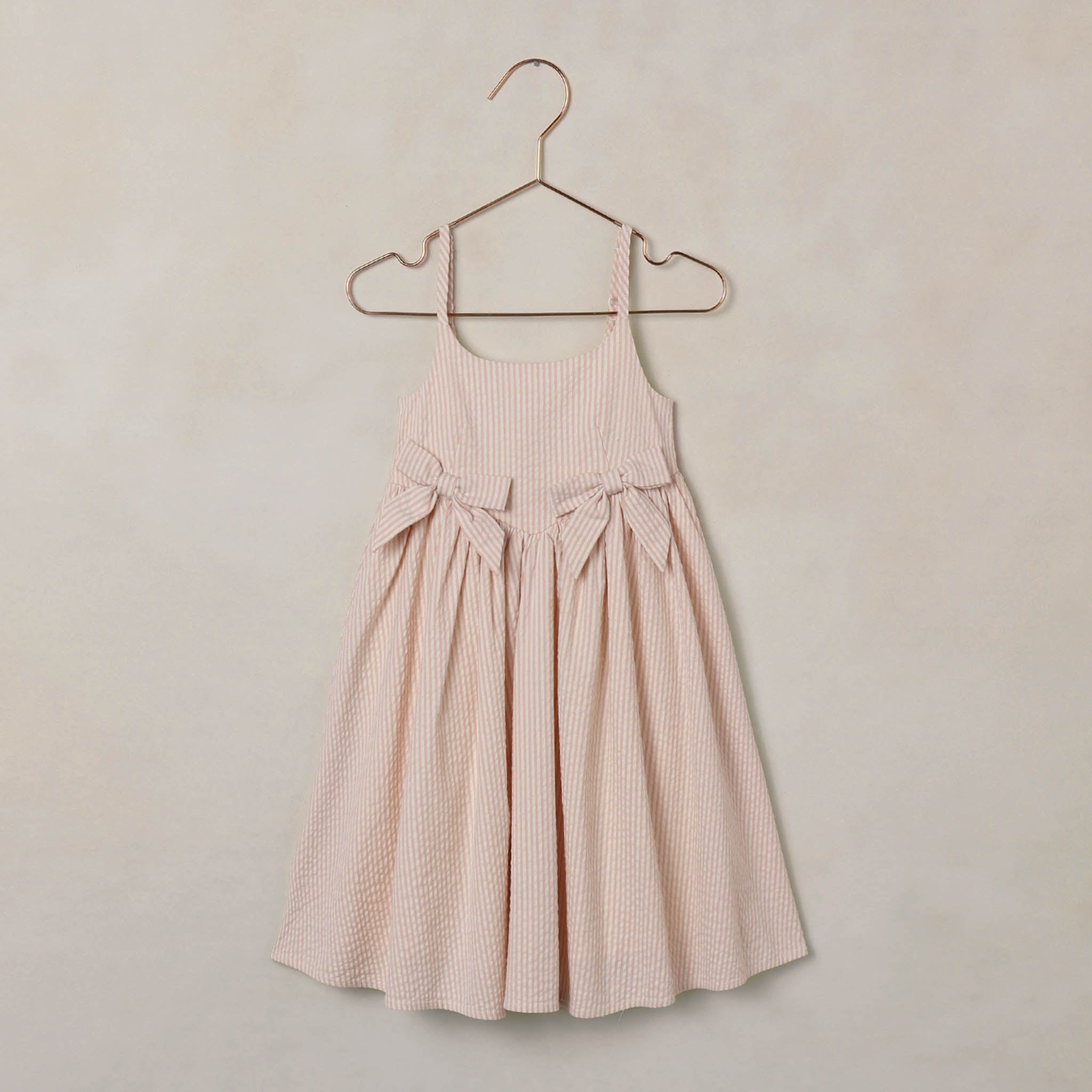 Notre robe midi Béatrice, fluide et ludique, est ornée de nœuds fixes sur le devant, de fines bretelles, de smocks au dos et d'une taille en V.