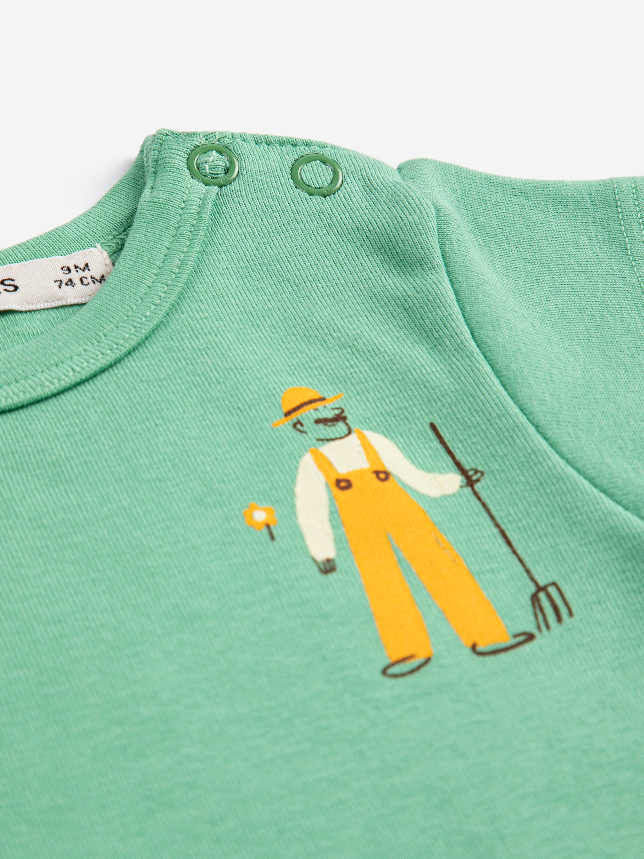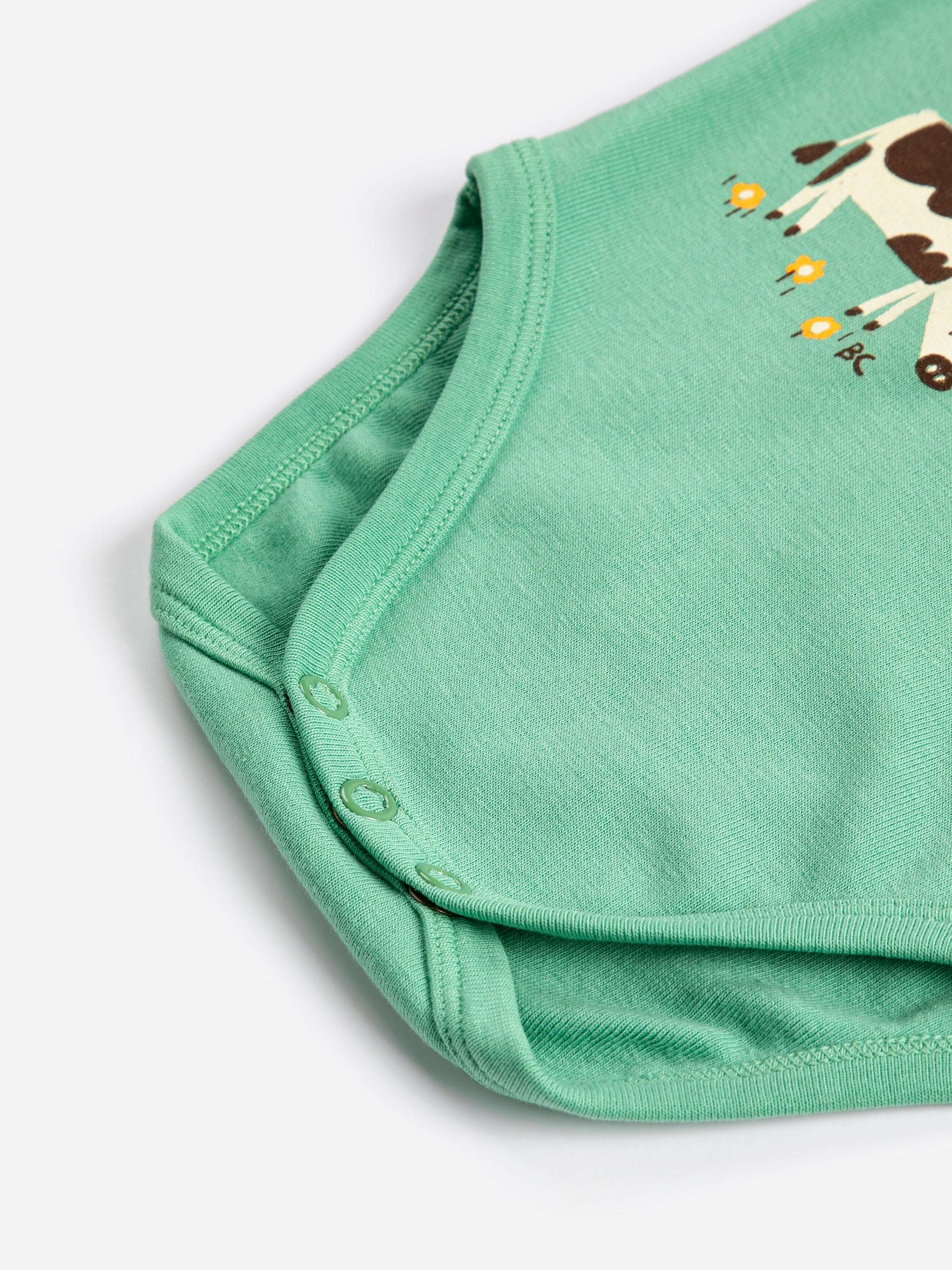 Cache-couche vert. Modèle à manches courtes, fermeture à pression aux épaules et à l'entrejambe, coupe ajustée et col rond.