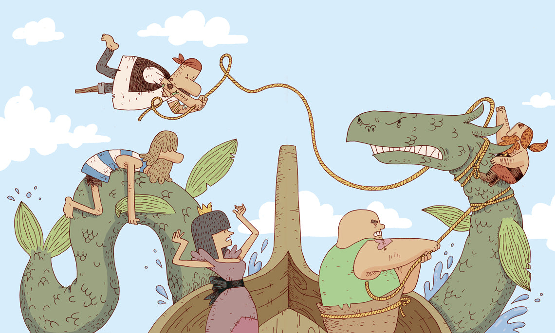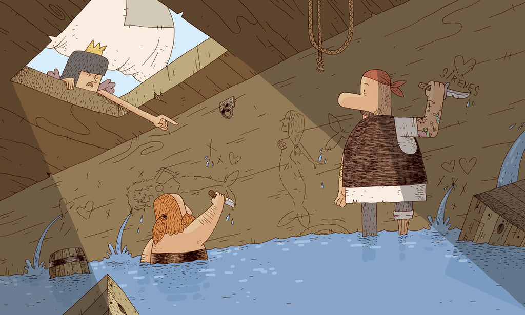 From the top of the most majestic tower of the Malotrus castle, Queen Et-Que-Ça-Saute scans the sea with her telescope. In the distance, she spots a tiny raft floating adrift.