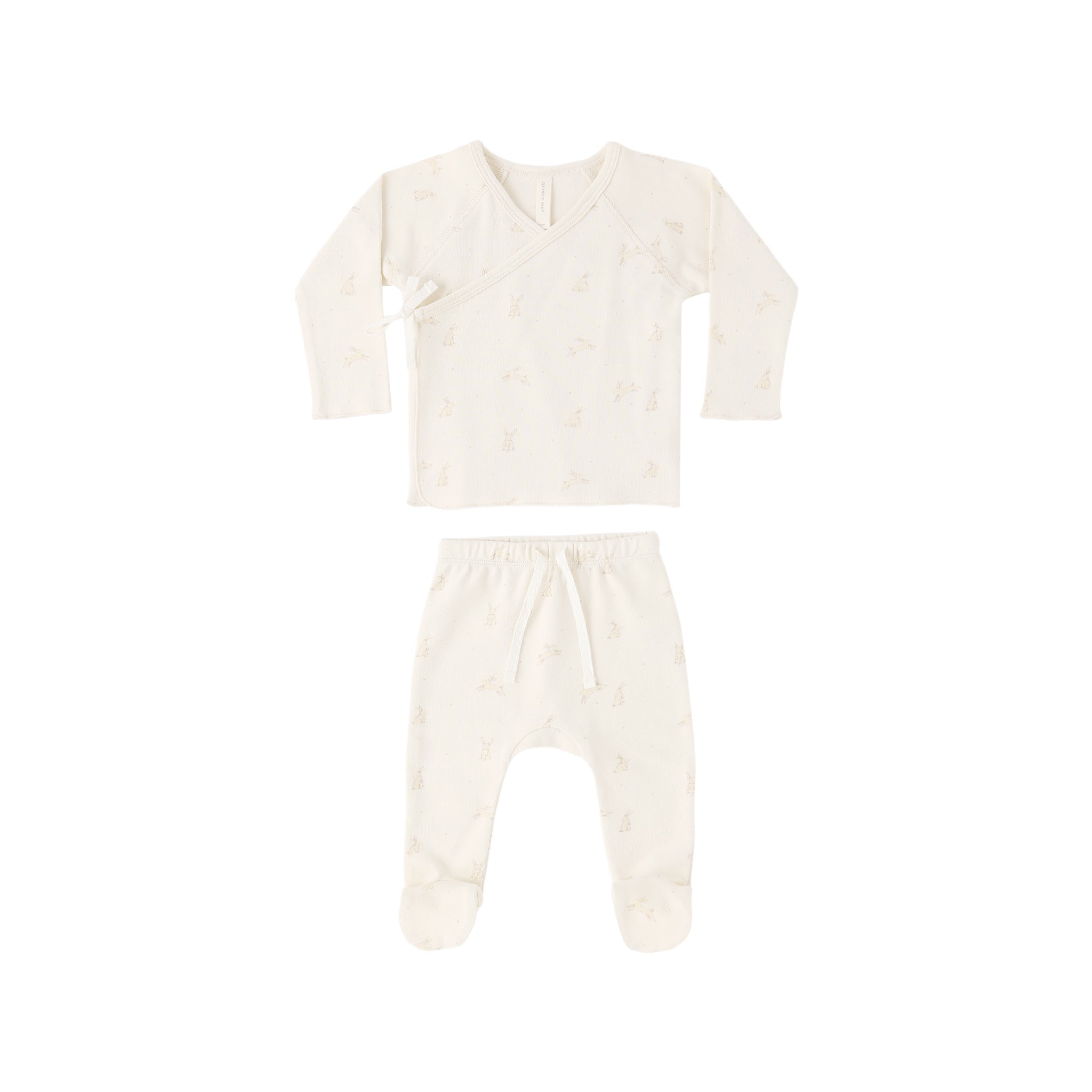 Accueillez bébé à la maison avec cet adorable ensemble. Il comprend un top cache-cœur à manches longues avec boutons-pression intérieurs et lien à nouer sur le côté, ainsi qu'un pantalon assorti à pieds et cordon de serrage.