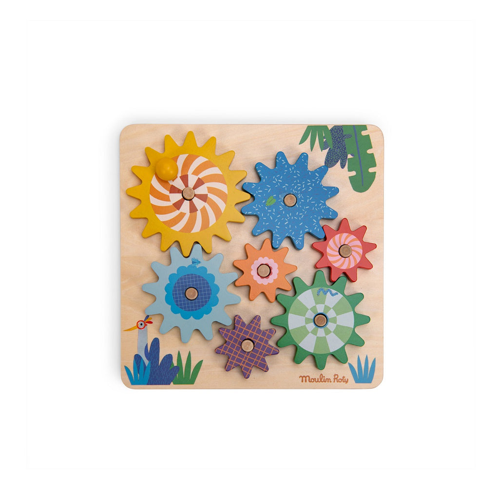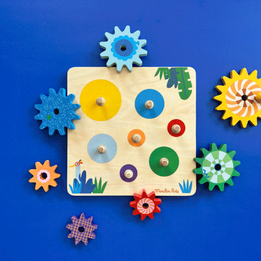Wooden game to discover gear mechanisms. Position the 7 multi-colored toothed wheels correctly on the wooden axles. When the yellow wheel is activated with the handle, the whole set starts to rotate in all directions. Washable with a soft and damp cloth.