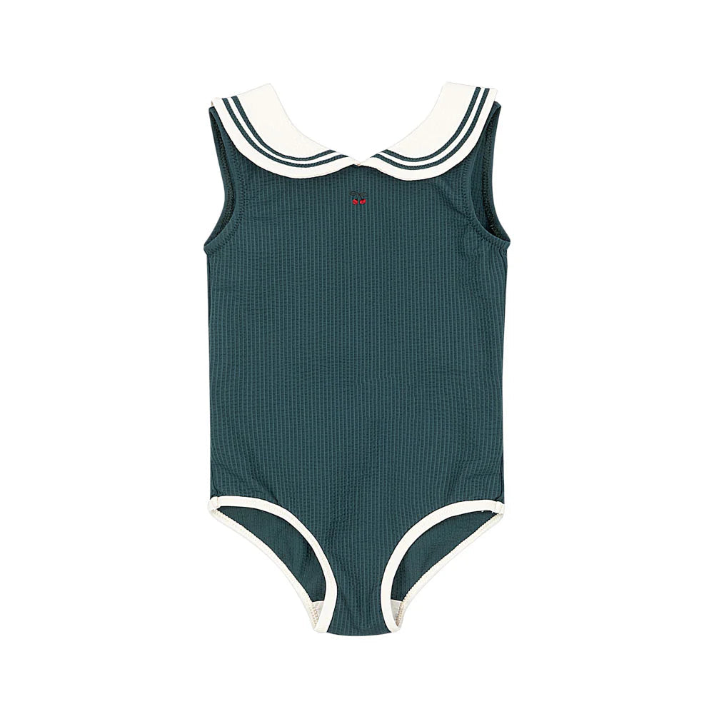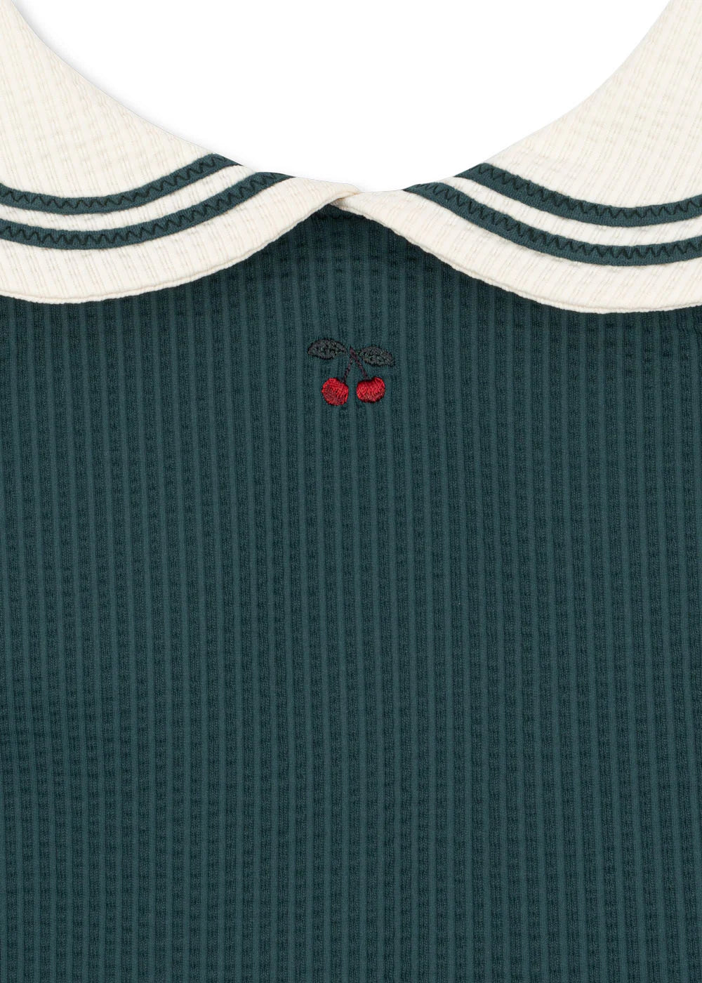 Maillot de bain à col marin et dos échancré en V. Orné de la cerise emblématique de Konges Sløjd sur le devant.