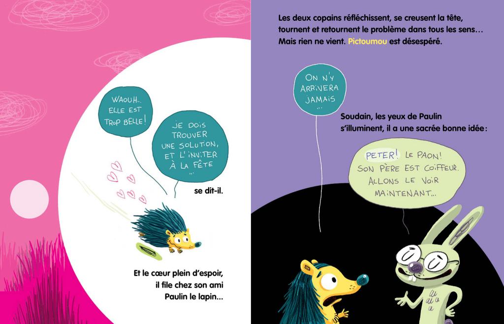 À l'école, on croise toutes sortes d'animaux : des sangliers, des chiens, des oiseaux, des renards, des lapins, et même des crapauds... Parmi eux, Pictoumou est bien embarrassé. C'est qu'il est le seul hérisson au monde à avoir les pics mous. C'est bientôt la fête de fin d'année et Pictoumou veut proposer à Maya de l'accompagner. Mais jamais elle n'acceptera d'y aller avec lui s'il ne trouve pas le moyen de faire tenir ses pics droit. Avec l'aide de son ami Paulin le lapin, Pictoumou tentera par tous les moyens d'avoir l'allure d'un vrai hérisson.