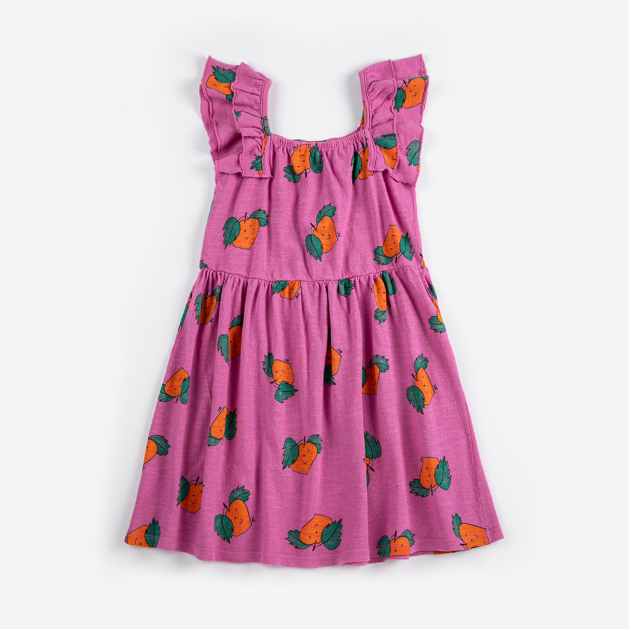 Robe violette. Modèle à bretelles, coupe évasée, longueur au-dessus du genou, encolure carrée et anses simples.