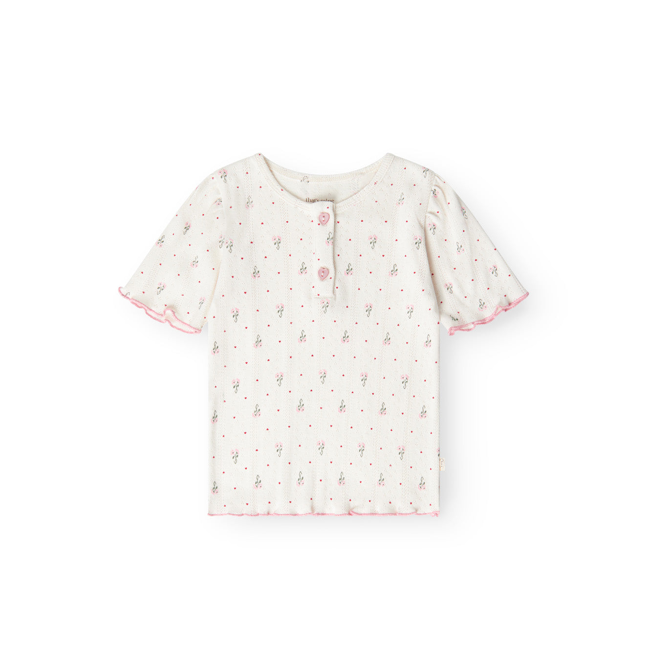 Offrez à votre enfant notre doux t-shirt en maille ajourée orné du ravissant imprimé « Amour en fleurs ». Patte de boutonnage à pression pour un habillage facile.