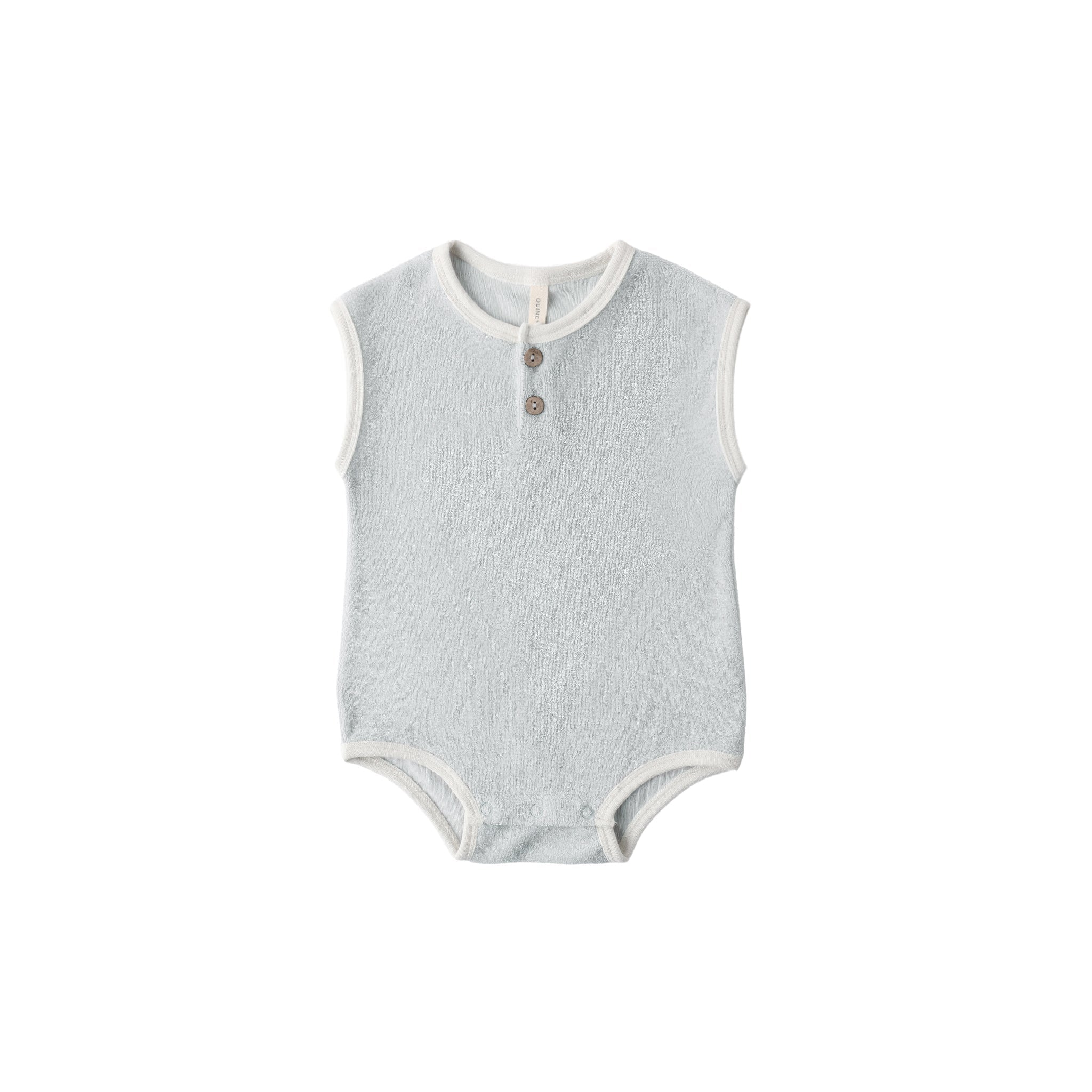 Notre barboteuse en tissu éponge présente des finitions contrastantes ivoire, une patte de boutonnage sur le devant avec boutons en noix de coco et des boutons-pression à l'entrejambe pour faciliter l'habillage.